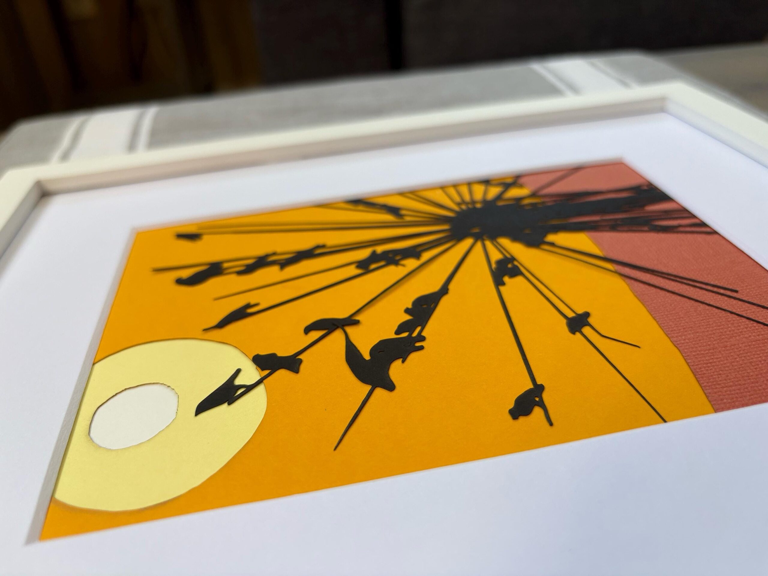 Construction: Each layer is individually laser-cut and assembled by hand. The intricate spoke pattern and multiple crow positions showcase the precision possible with layered paper techniques.