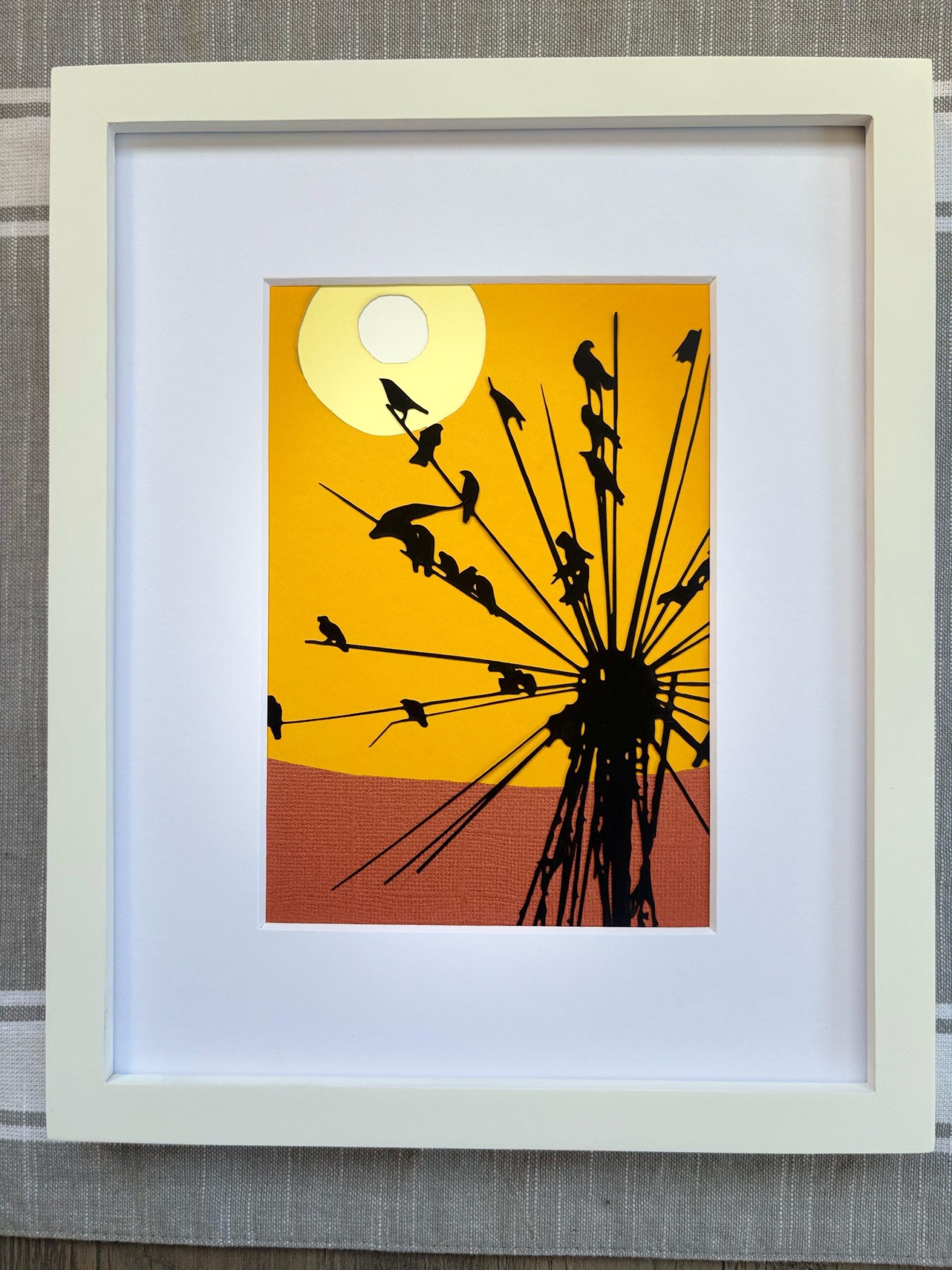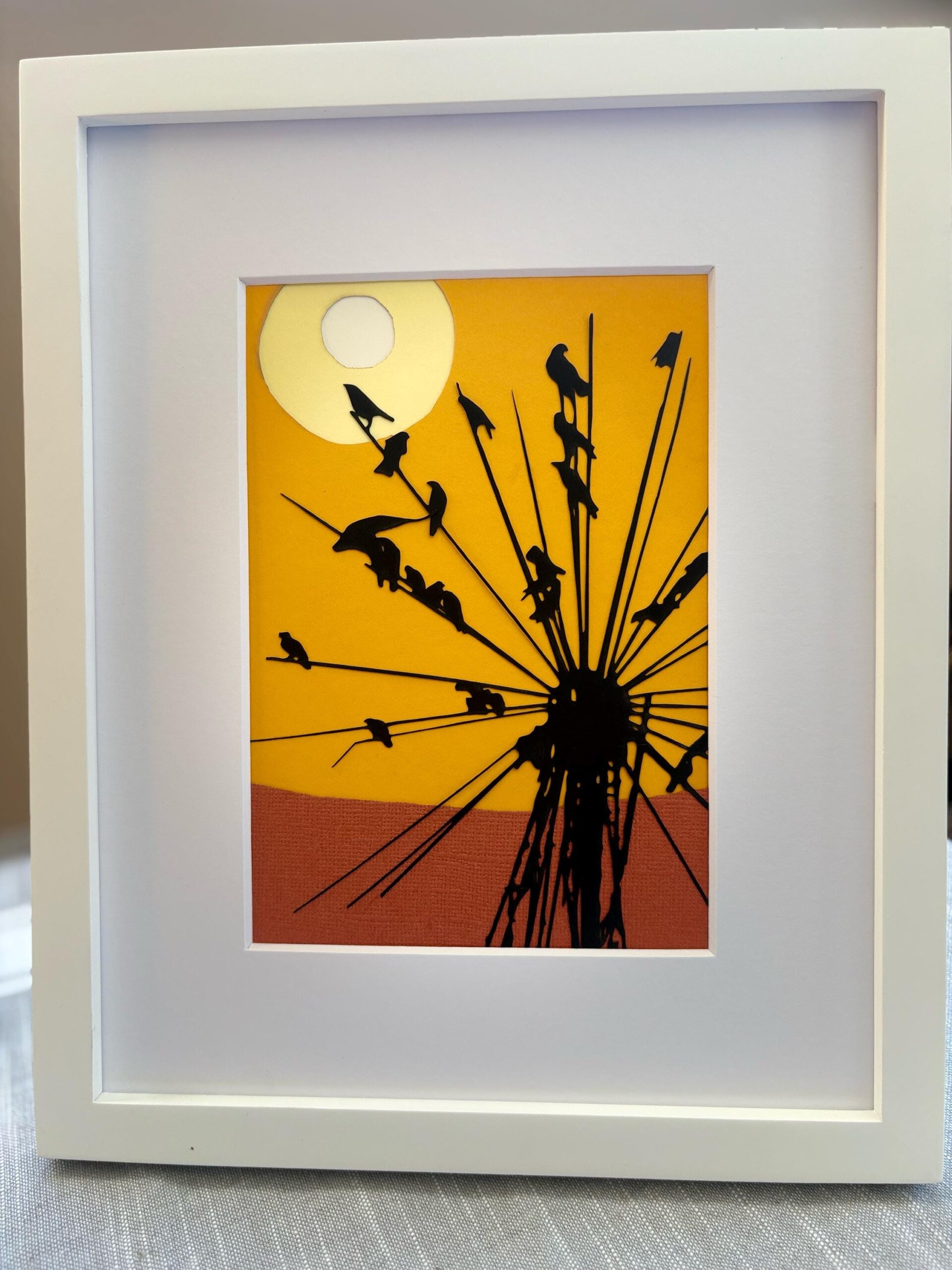 A flock of crows gathers at sunset, silhouetted against warm tones. Created with precision-cut paper layers for dimensional depth.
