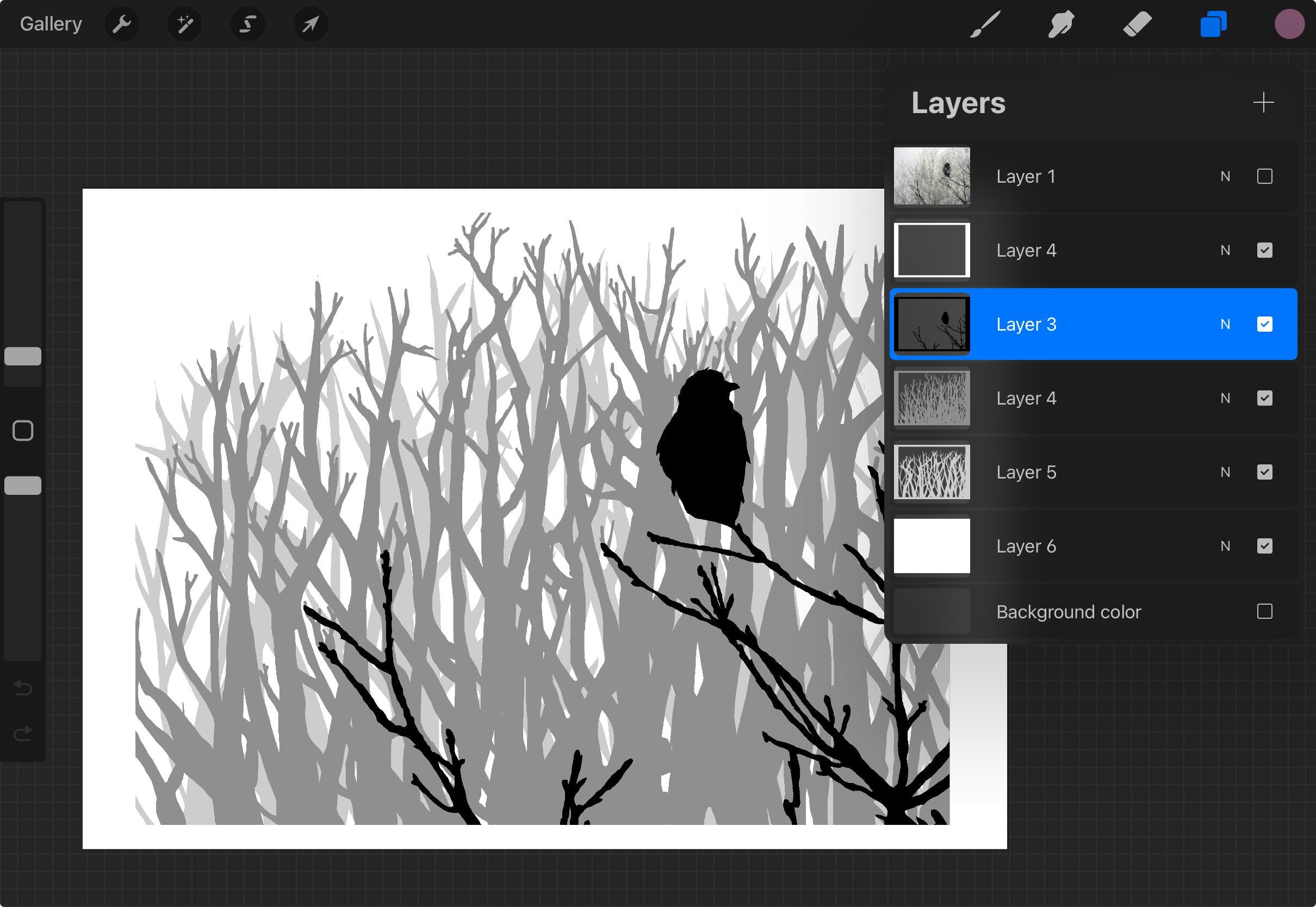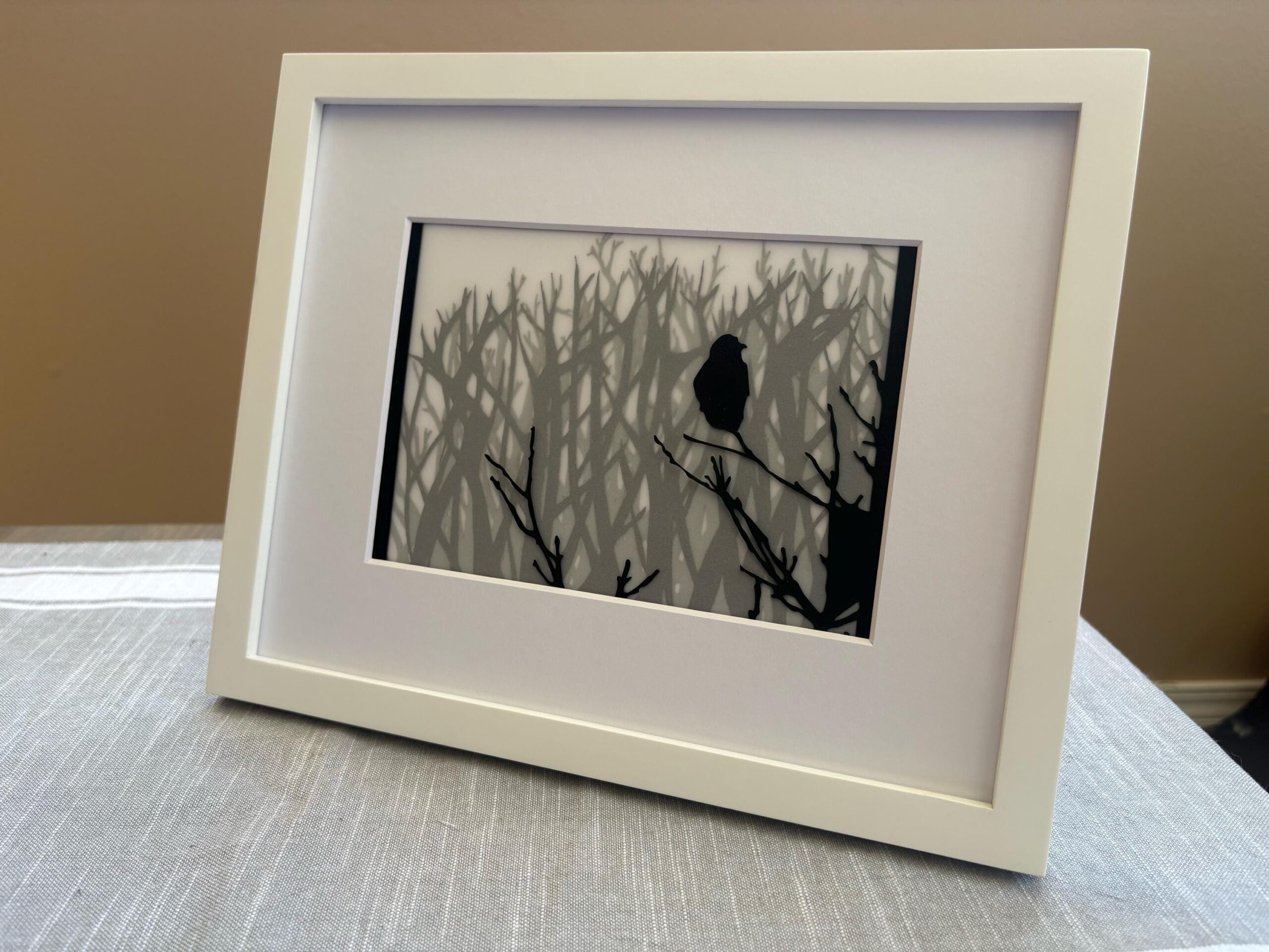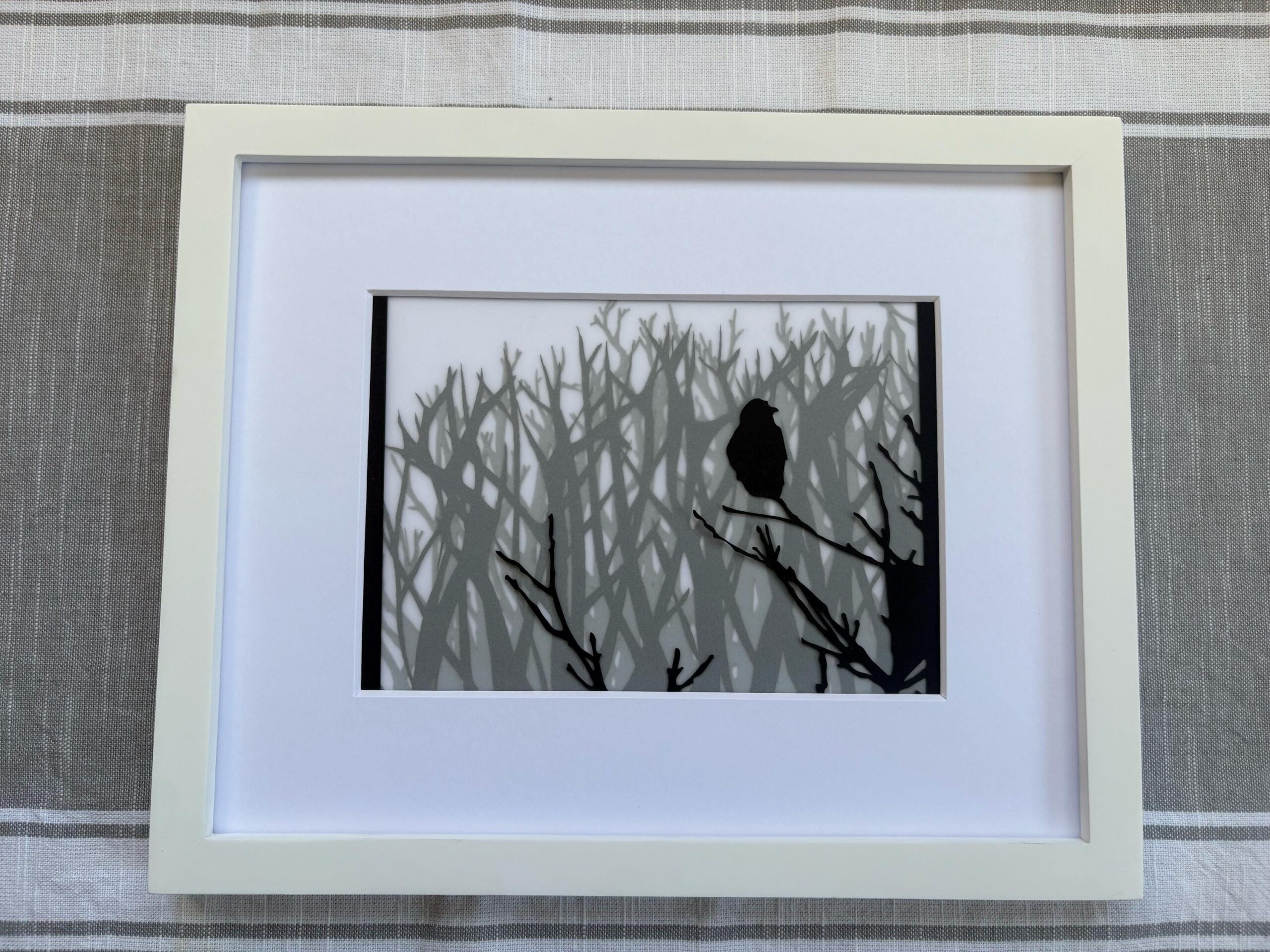 This artwork features a black crow silhouette positioned on delicate branching, set against a complex background of bare trees that create beautiful layered shadows. The multi-layer construction produces dramatic depth.