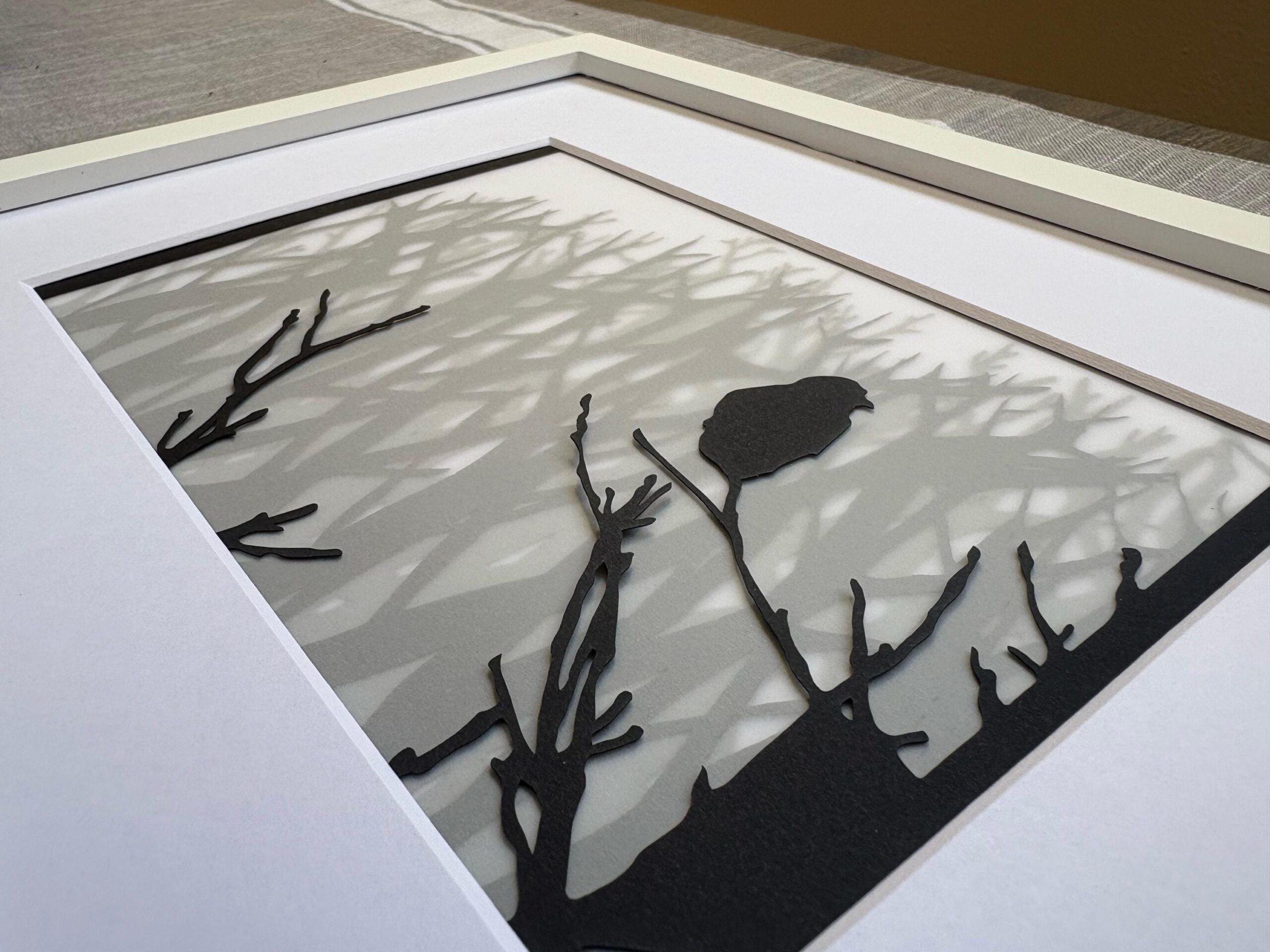 A crow stands watch among bare winter branches, its silhouette cast against intricate shadow patterns. Created with precision-cut paper layers for dimensional depth.