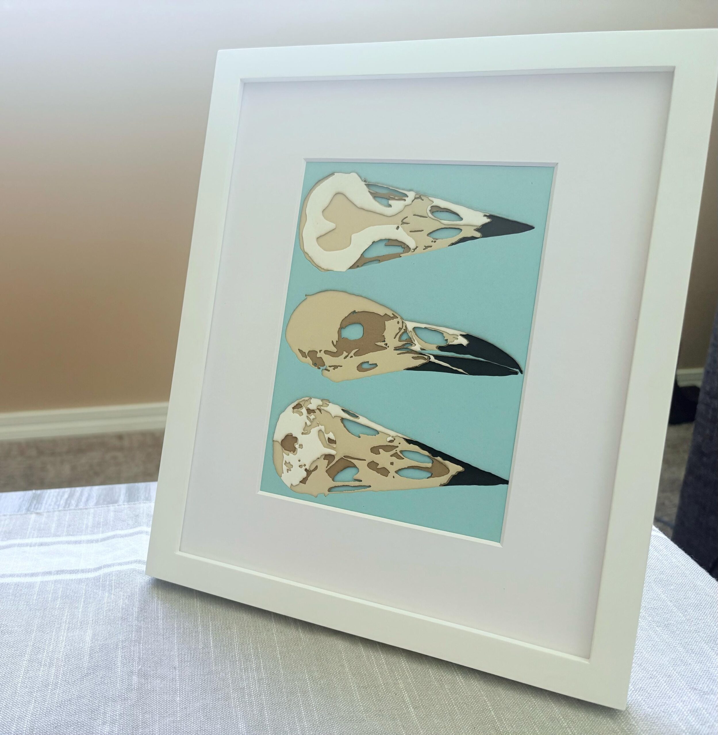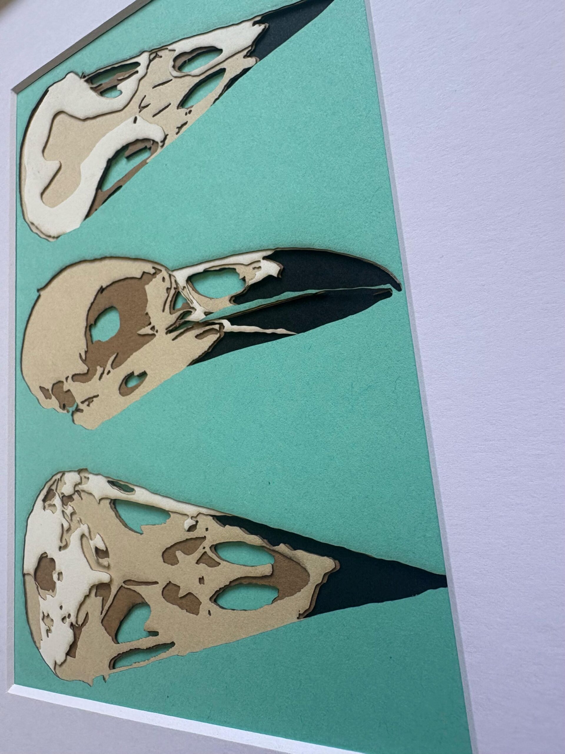 Three crow skull specimens are arranged in a scientific display style against a turquoise background. Created with precision-cut paper layers for dimensional depth.