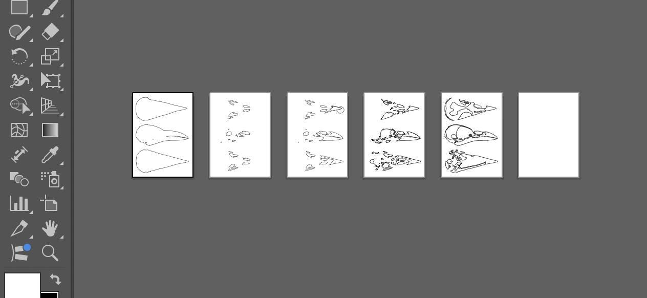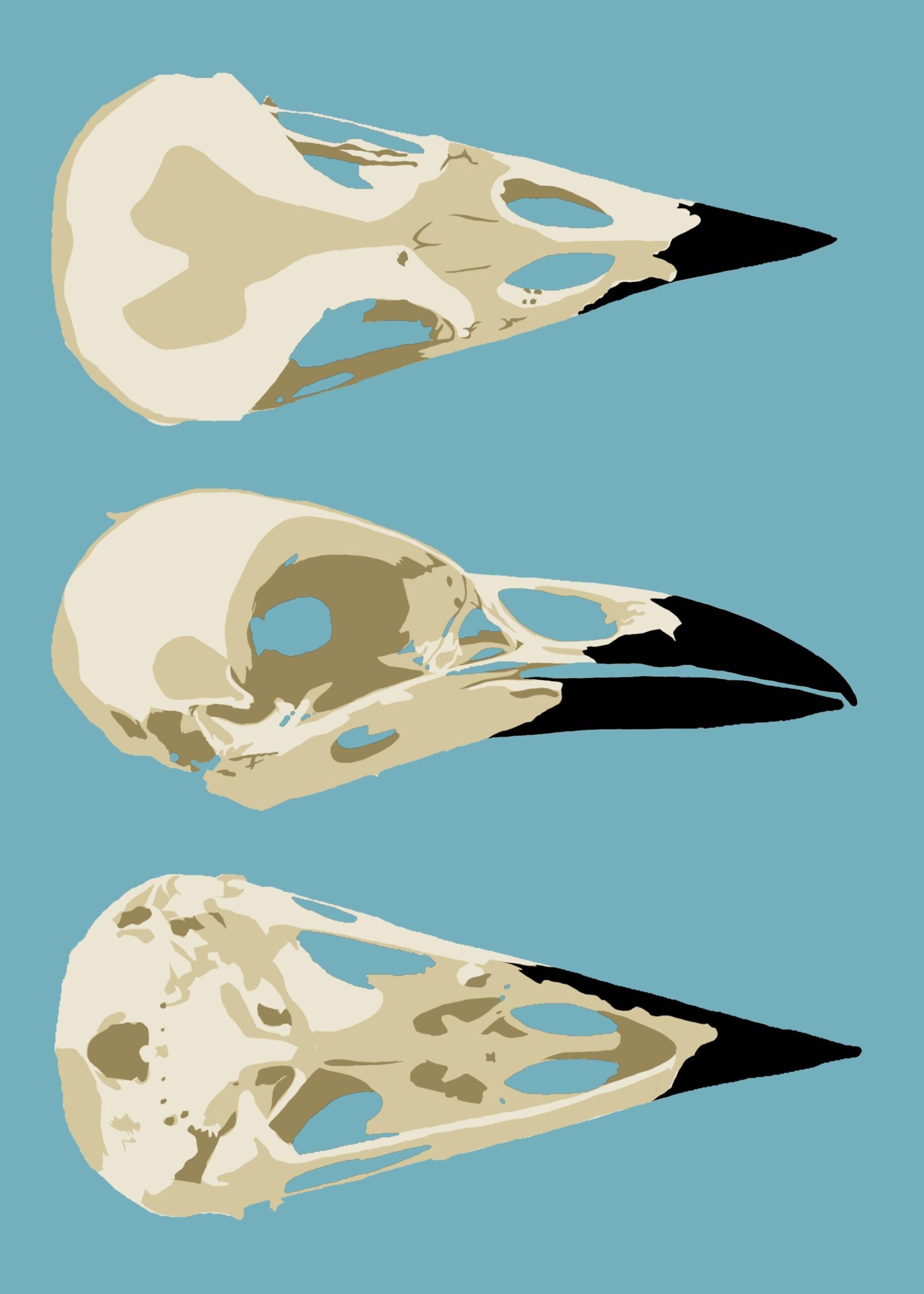 This artwork features detailed crow skulls in natural bone tones of cream, tan, and brown, showcasing the intricate anatomy and varied angles of the corvid skull structure. The bright turquoise background creates a striking contrast.