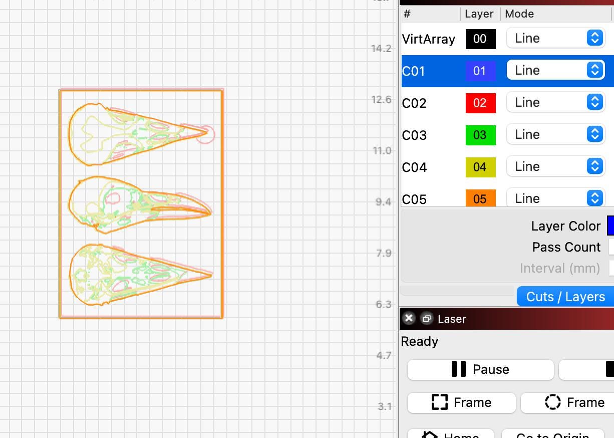 Construction: Each layer is digitally drawn by hand, converted from PNG to SVG to GCODE, individually laser-cut, and assembled and edges sealed by hand.